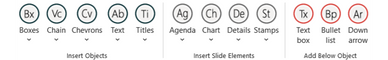 When in PowerPoint you will need to activate the Ribbon group titles in Preferences first. If you don’t have the Ribbon Group Names showing (like ‘Insert Objects’ or ‘Insert Slide Elements’ on the Design Toolbars toolbar): Select the PowerPoint menu at the top > Preferences > View > and tick ‘Show group titles’ .
